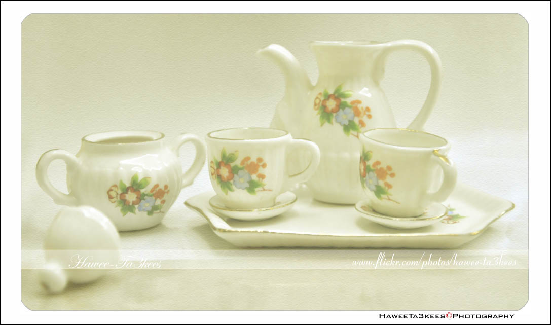 This is a small scale of a Tea Set, sugar place and tea cup in a small plate. Photoshop used to add the effect and color tone.