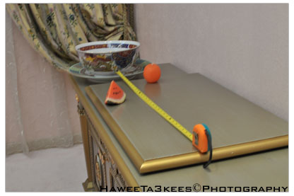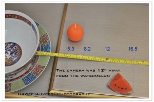 Here is a studio set-up for a shot, I used the natural lights from the windows and the room light, Nikon D90 with Nikon 35mm lens with f/1.8 to get the DOF effect, subjects are Watermelon, Orange [made of candle]and The Chinese’s Porcelainin in different distance from each other.
