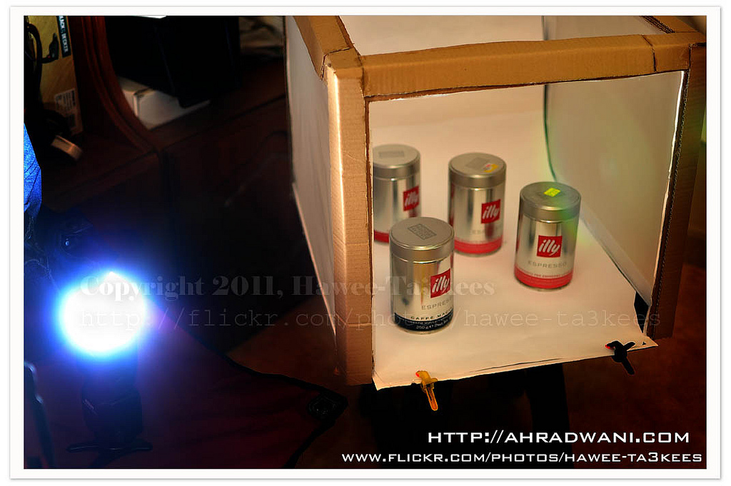 This is my studio to shot the illy boxes or cans, I used my Nikon SB900 head up and remote fire, the D90 with Nikon 35mm lens mounted on the tripod.