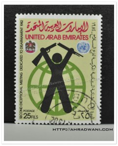 This stamp issued in 1982for the occasion of the “Second Exceptional Meeting Dedicated to Disarmament” in UAE.