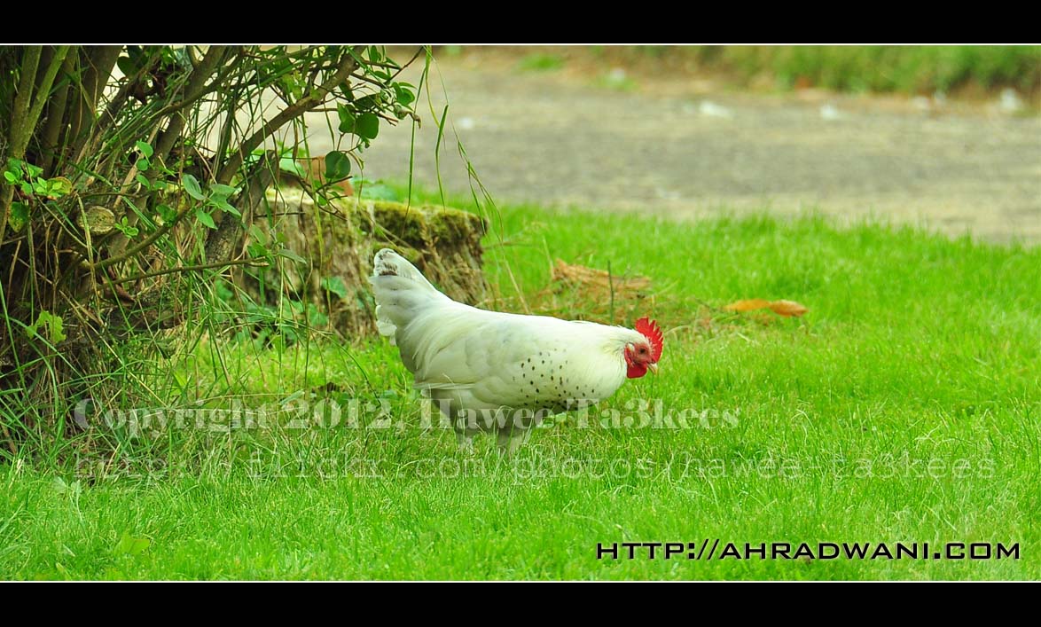 Searching for the food is the only activity for the Roosters and chickens, here is a White Rooster looking for something to eat in the grass. It was about 15 meters away and I am using the Nikon 18-300mm lens to take the photo.