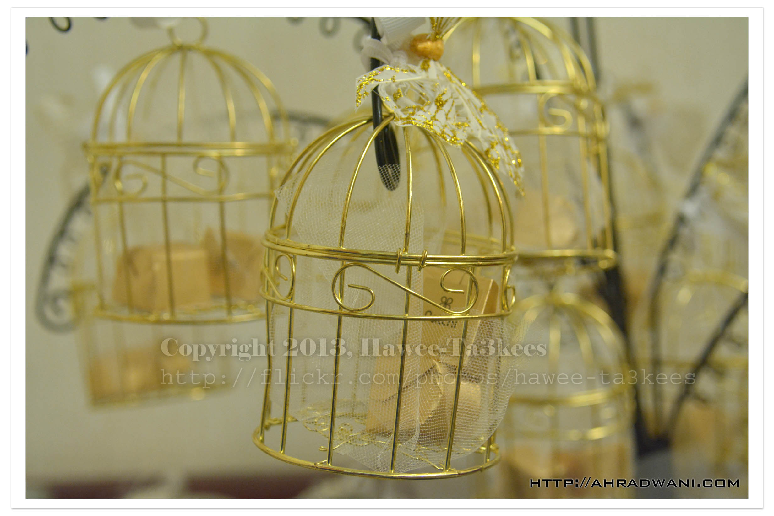 Small cages hangs on a stands with piece of chocolate inside each one, this accessory used in a wedding party.