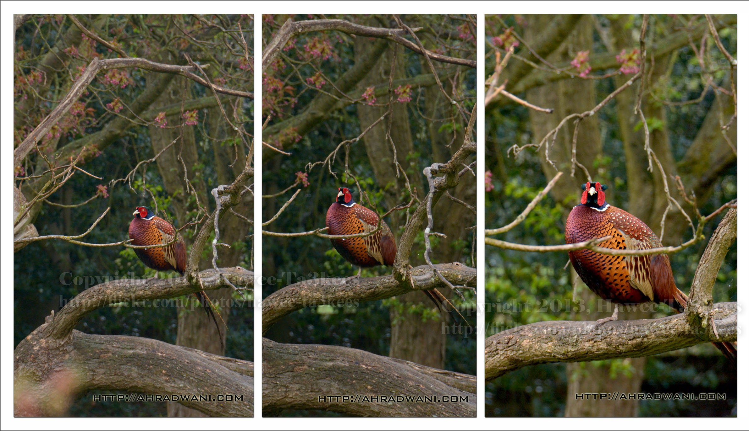 In a cloudy/rainy day this Pheasant was resting on the tree 1 meter of the ground, I was 35meter away and start taking photos and getting closer to almost 20meter, I get some great shots and this is a 3-N-1 photo.