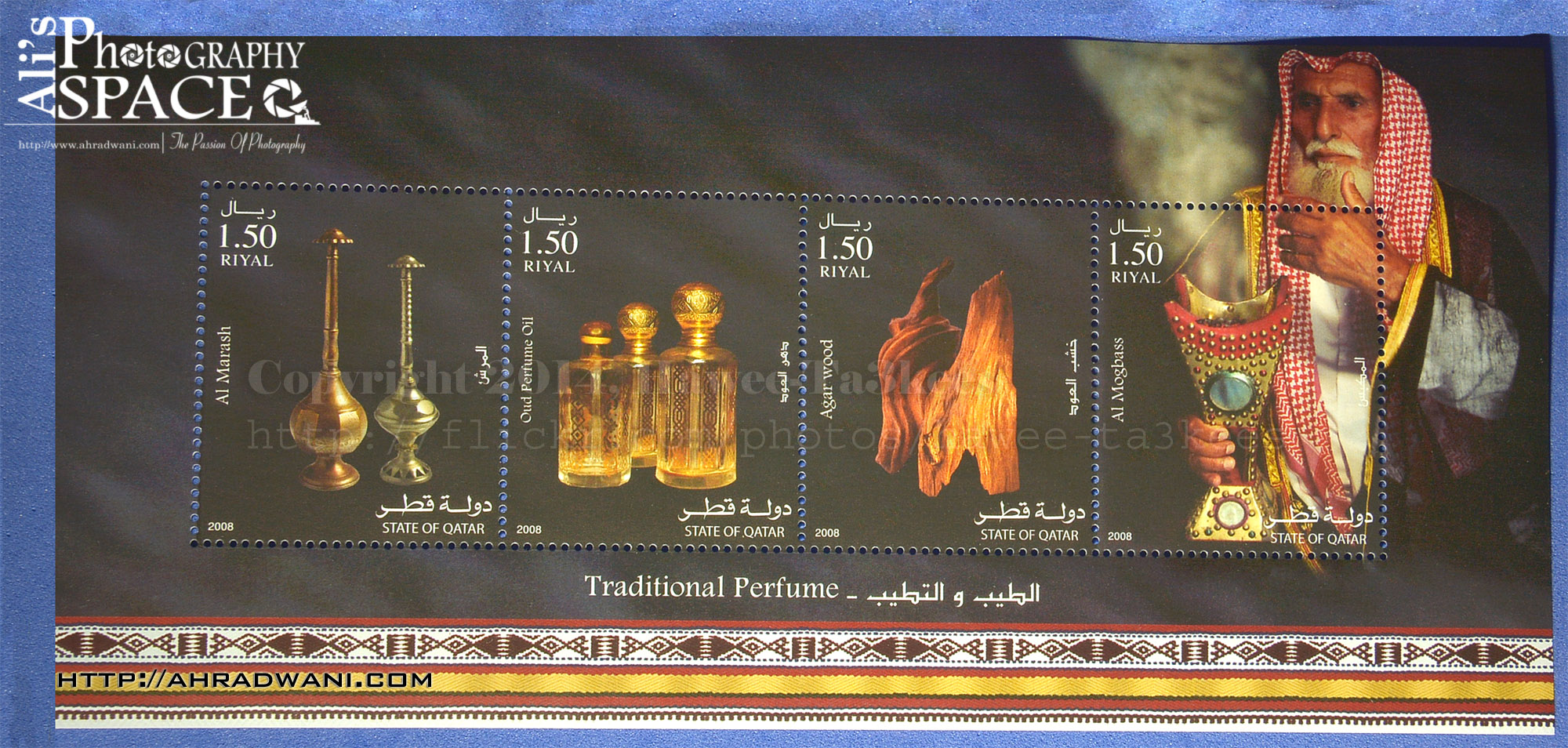 This Arabic Traditional Perfume is one of the most famous things you can give as a gift some are very expensive but very beautiful smell. Here are a set of four Arabic Traditional Perfume stamp Issue in Qatar 2008. Click to enlarge.