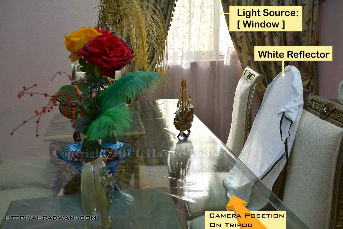 This is the studio Setup of the “The Boat“ I use the normal day lights from the window and use a white reflector also low shutter speed 1/5 Sec, the camera Nikon D7100 mounted to a Tripod and i use the remote shutter release ML-L3 and Nikkor 18-300m lens.