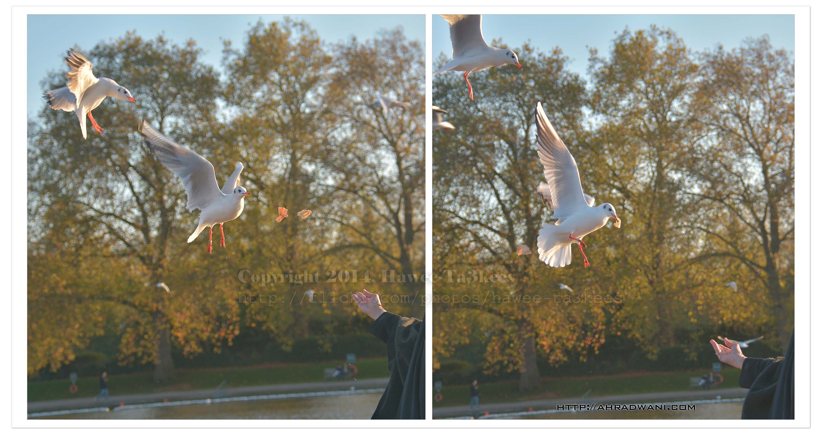 In HydePark, Woman aimed some bread crumbs in the air, and here is one of the birds of the lake picks up a piece of bread. Two photos been merged into one.