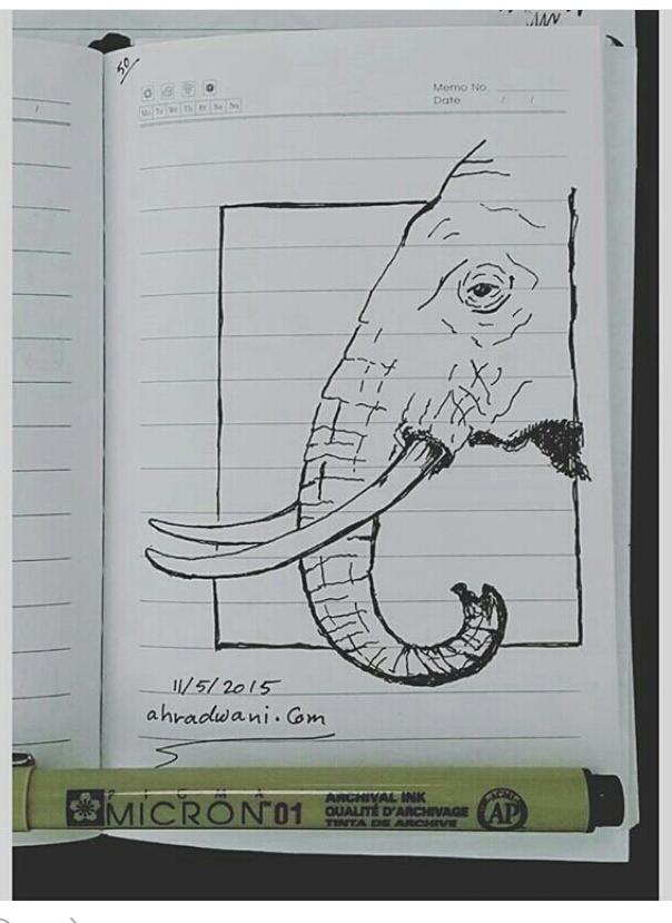 سكيتش وجه فيل باستخدام قلم حبر، محاوله لتطوير مهارة الرسم