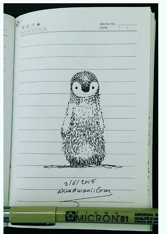 رسم سكيتش طائر البطريق باستخدام قلم حبر وأسلوب التنقيط. .