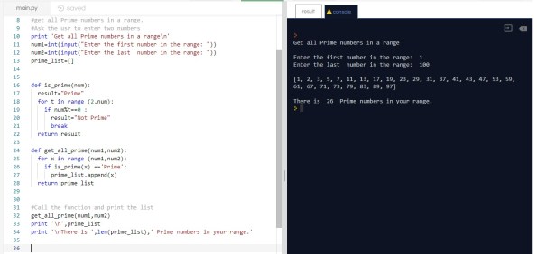 So, here we will ask the user to input two numbers num1 and num2 the we will pass all the numbers in the range to is_prime() and store the result in a list.
