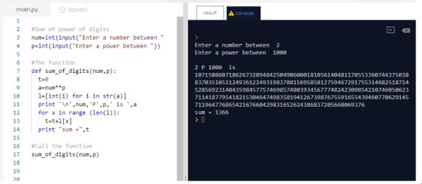 The Task: So our task in this project is to find the sum of the digits of (2^1000). To write this as a program and to make it more general we will ask the user to input the number and the power he want, then I start thinking to restrict user from input large numbers that could cause CPU problems, but then i decide to keep it open as is.