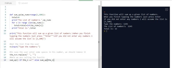 print(“This function will sum up a given list of numbers.\nWhen you finish typping the numbers just press “”Enter””\nIf you did not enter any numbers i will assume the list is [1,100]”)