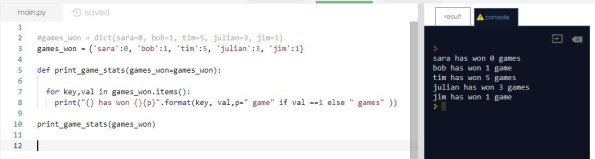 print(“{} has won {}{p}”.format(key, val,p=” game” if val ==1 else ” games” ))