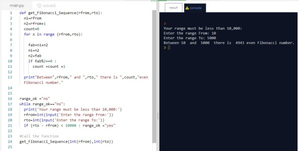 print”Between”,rfrom,” and “,rto,” there is “,count,”even Fibonacci number.”