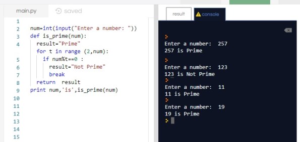 This function will ask the user to write a number then we will examine it to see whether it is a prime or not.