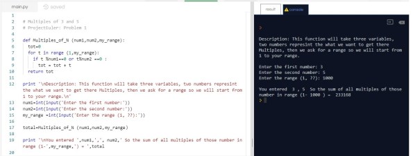 My way, as i like to do open code works for any numbers, we will ask the user to enter three numbers, num1 and num2 will be as (3 and 5) in the task, my_range will be as the 1000. So the code can get the sum Multiples of any two numbers in a ranges from 1 to my_range.