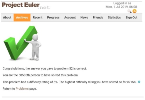 This task Completed on Mon, 1 Jul 2019, 06:08, the goal is to find a number X that if we get the X, X*2, X*3, X*4, X*5, X*6 all the numbers are same digits but in a different order.