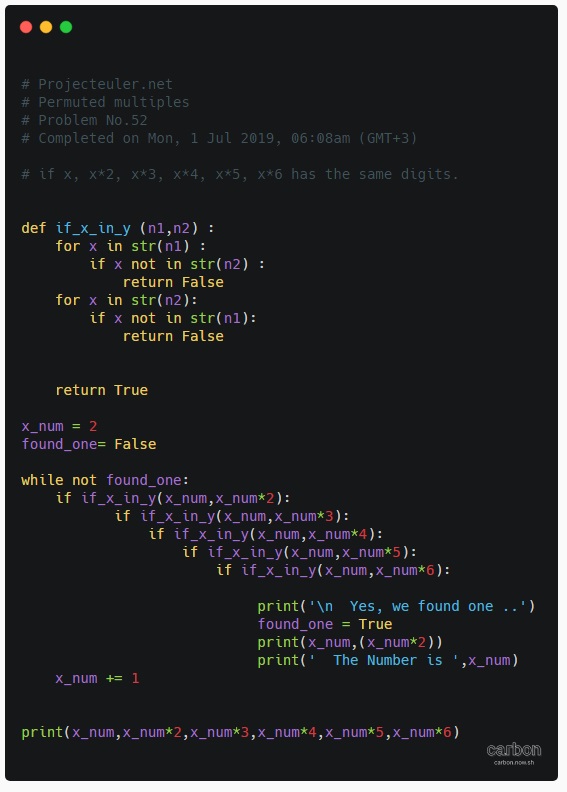 I use a function called if_x_in_y (n1,n2) will return True if the two numbers has same digits, False if not. Then a while found_one is not True a loop will examine all numbers starting from 2 until we found_one.