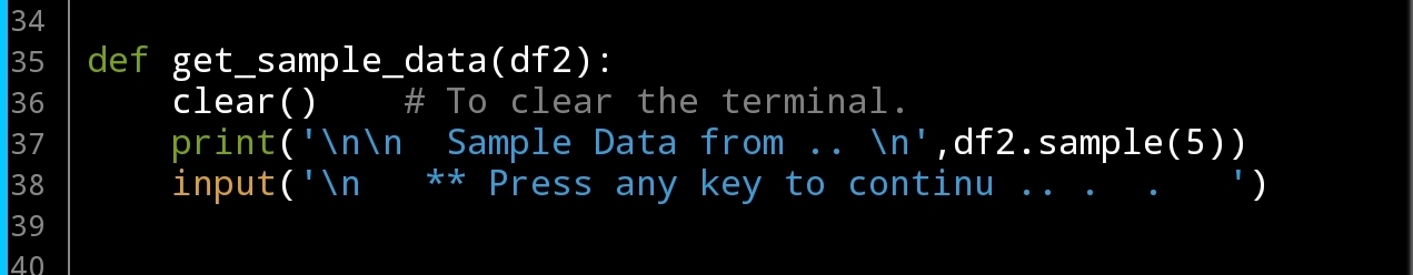 Summary: At this point we have the menu and two functions, each time we run the app we need to select first number 1 to load the data into a df, the idea behind this was to give the user the opportunity to select any data file from any path, but in this stage the data file will be static in the code. this feature will be in version 2.0 After loading the data we can select number 2 from the menu ( Show sample data ).