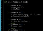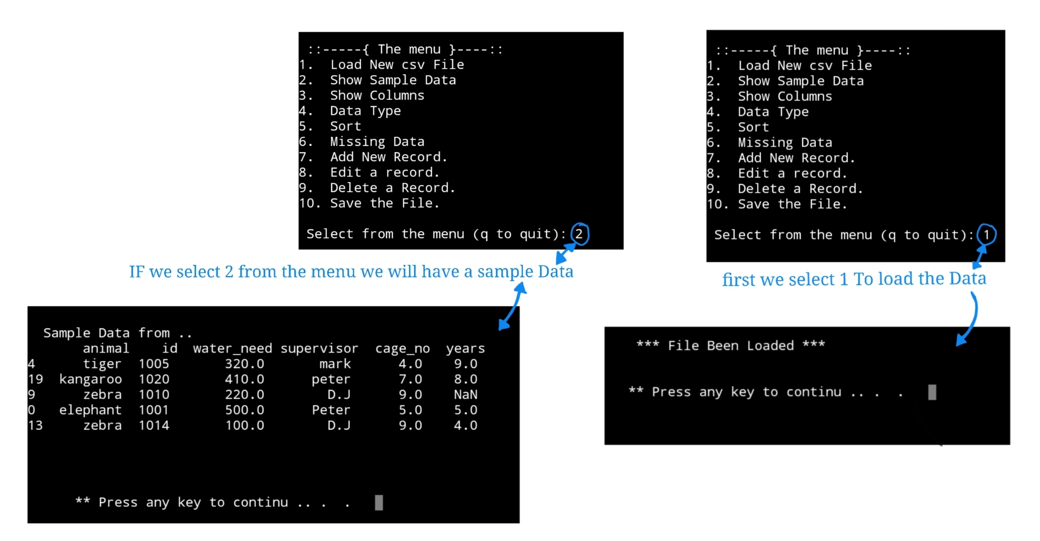 In this lesson we will write two functions in our Zoo Management System-ZMS, first one to load the data file (we assume we have our data file in the same directory of the .py file.) and the second one is to display a sample 5 rows from the data. We will write each function and test it then we will add it to our main app user_choice() section and will try it from there. At the end of this post you can find a screen shot of the user_choice() code with two function in place.