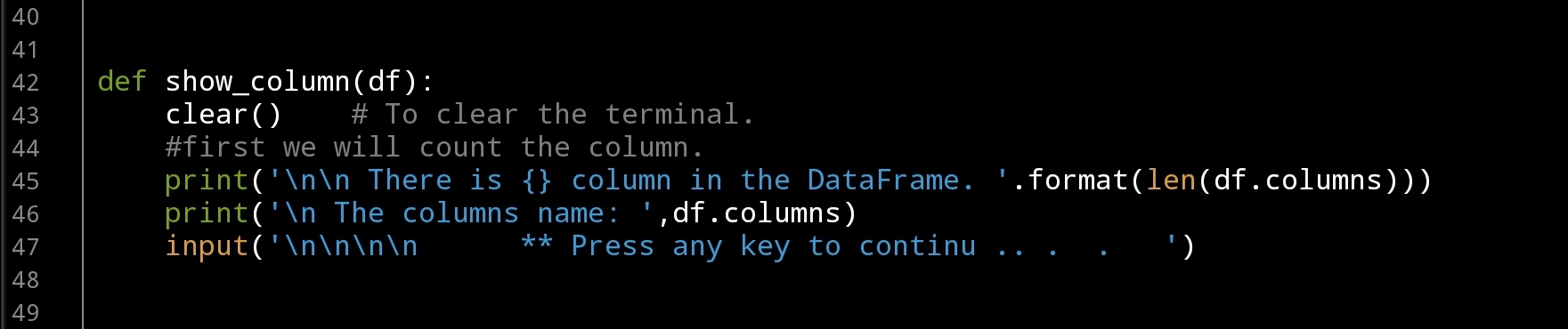 print(‘\n\n There is {} column in the DataFrame. ‘.format(len(df.columns)))