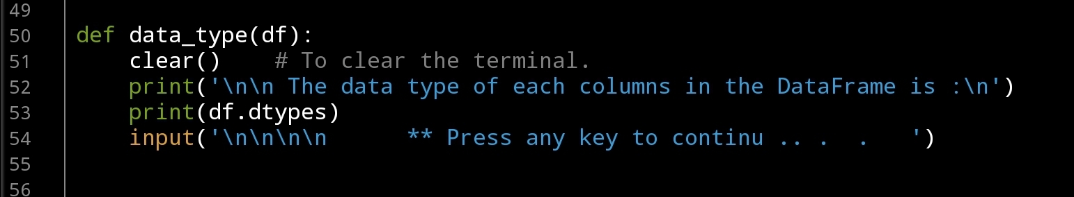print(‘\n\n The data type of each columns in the DataFrame is :\n’)