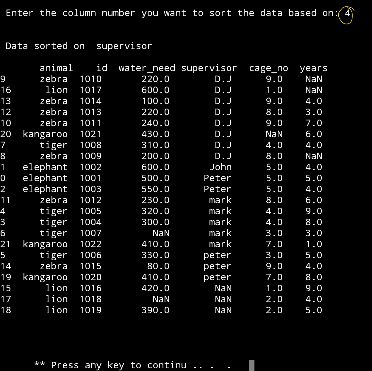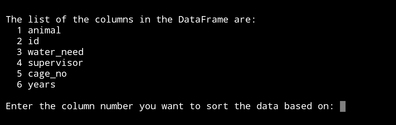 u_sele=input(‘\n Enter the column number you want to sort the data based on: ‘)