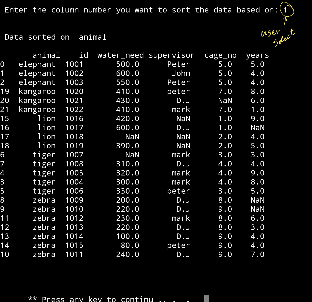print(‘\n’,df.sort_values(df.columns[int(u_sele)-1]))