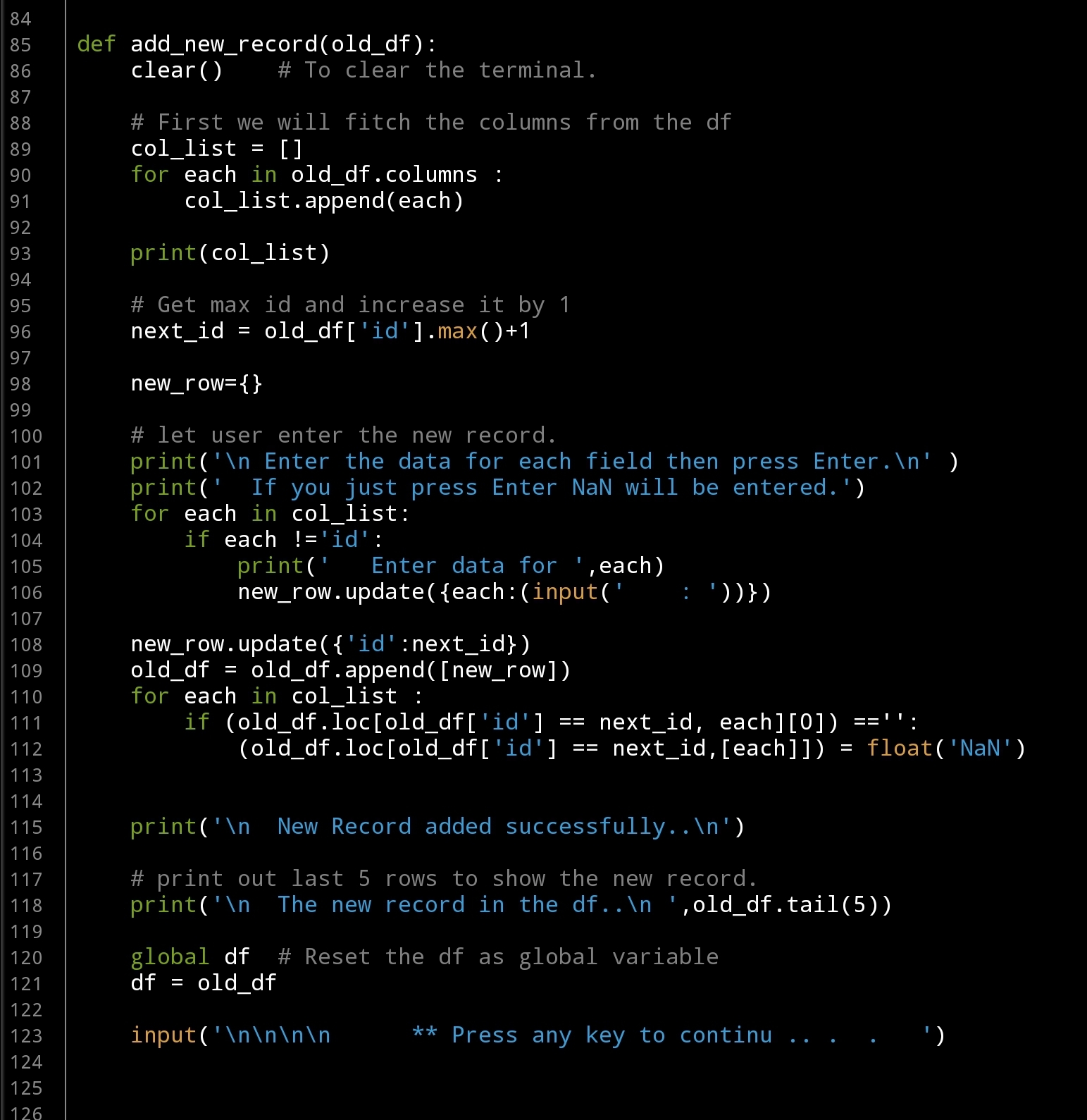 First we will work on Add New Record, from the name we know that this function will allow the user to add a record to the DataFrame, first we will get all columns in the dataframe, also we will get the maximum value in the ID column and increase it by one, then we will ask the user to enter the data for each column, and we are assuming that the user will (or MUST) enter a valid data since we agree that we will not have any validation test in this version of the application, also if the user just press ‘Enter’ thats mean NA data so we will add NaN to the field.