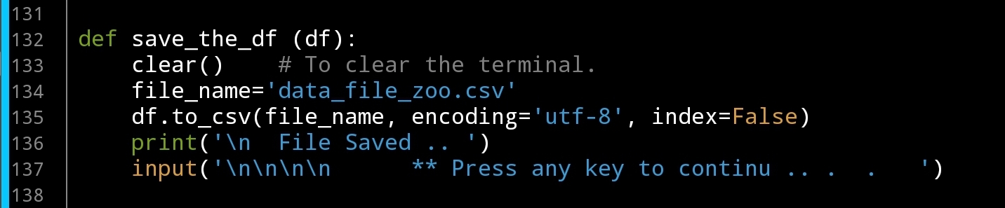 Save : At this point we will jump to the last function, simply after adding data to our DataFrame we need to keep this change, we need to save the new record so we can retrieve it next time we run the application. So to do this we will re-write the csv file again.