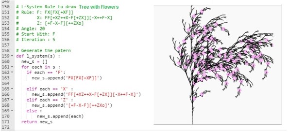 In the first two parts of the L-System posts (Read Here: P1, P2) we talk and draw some geometric shapes and patterns. Here in this part 3 we will cover only the Fractal Tree and looking for other functions that we may write to add leaves and flowers on the tree.