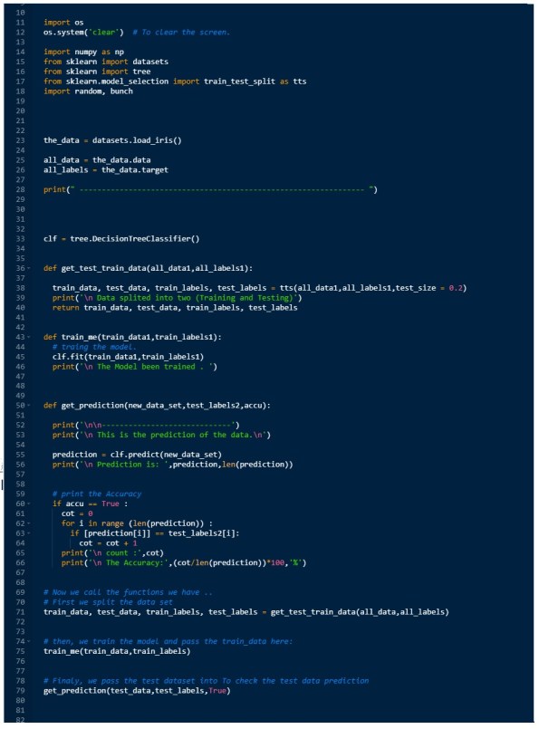 # import libraries import numpy as np from sklearn import datasets #from sklearn import svm from sklearn import tree from sklearn.model_selection import train_test_split as tts import random, bunch