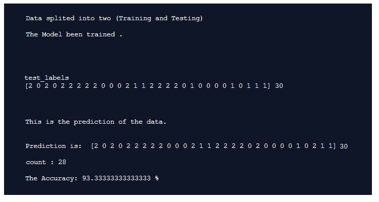 Result screen shot after running the Iris dataset showing high accuracy level.