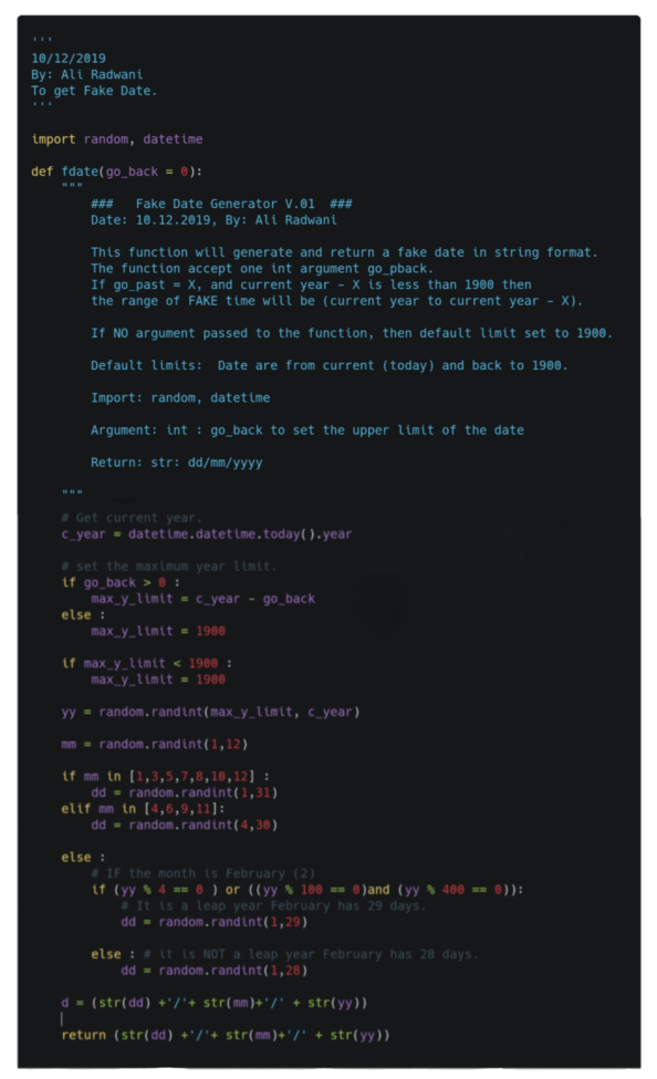 The fourth function of our Fake Data Generator will be the date function, from it’s name this one will generate a FAKE Date in yyyy/mm/dd format. The function will have one argument (go_back) for range, the max-limit is current date (today) and mini-limit will be (1/1/1900), if the user did’t pass any thing for (go_back) then the range is (from current to 1/1/1900) and if the user pass (X) then the range will be ((current date) to current – X_YEARS). Also in dates we need to take care of Leap Years, In leap year, the month of February has 29 days instead of 28. To solve this in our function we can use two ways, first one (the easy way) we know that we are generating a random numbers for months and days; so we can say if the month is February, then days can’t be more than 28. But if we want this thing to be more realistic we need to add more conditions such as :