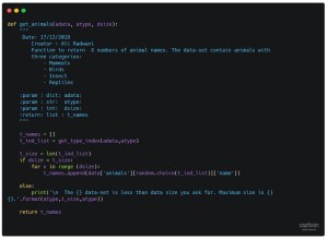 Creatures data-set:This data set is containing the name of animals and their types, animal types are: mammals | insects | birds | reptiles. Our function def get_animals() will take three arguments: the data, the type of animal we want and the size, and it will return a list of animals names.