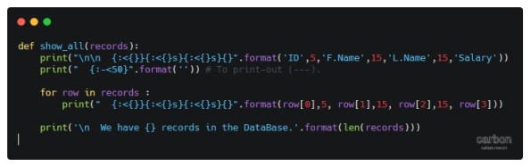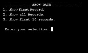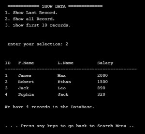 Now we remember that we run the dummy_data() function (above) so we have four records in our Employee Table, so if we want to see the records we will select first option in the Main Menu: 1. Show the data. this will call a function called show_data() as in this screen shot.