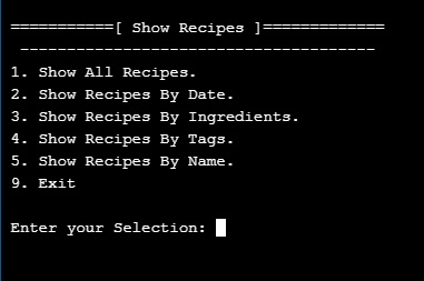 Second menu to write is “Show Recipes”, the user will use this menu to display and read the Recipes.