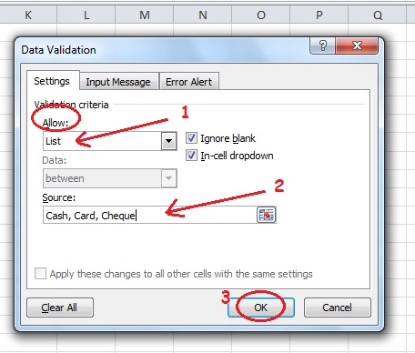 - Then in Source box, we need to type the items we want to appear in each cell as a drop-down list separated by a comma. Cash, Card, Cheque