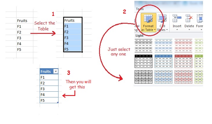 Dynamic Approach: If we have a list of items and this list is growing (We may add more items ti it), such as Fruit list in a grocery, then we will use the Dynamic drop-down list. In this case I prefer to use a new Excel Tab call it “Setting”, so we will create one. On that Tab create a Table call it “Fruit” and list all the fruits you want to be appear in the drop-down cell list (In this example I will list down F1, F2, F3, F4, F5), Select the table and from Menu select “Format as Table” and just chose any format you want. Here is a screen shot.