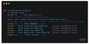 Now, our function will get the four set of information for Grand Totals in the world as Total Countries has COVID-19, Total Cases of COVID-19, Total Deaths by COVID-19 and Total Recoveries from COVID-19. Here is the function