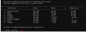 print('\n Covid19 Country Data.')