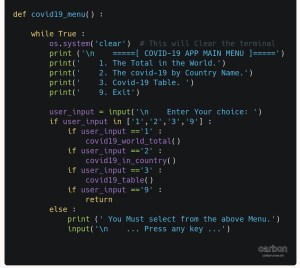 In the last Function, we will let the user to select the Country name then we will display the Covid19 information regarding his selection. So to perform this action, First we will create a list of all Countries Name, and display the list on the screen asking the user to select (Enter) the index number of any Country, then we search for that country name and grab it’s Covid19 Data. Here is the code..