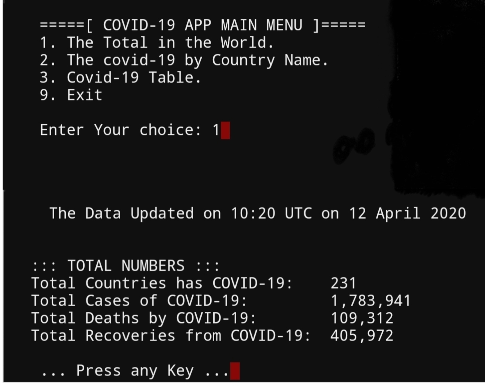 print ('\n =====[ COVID-19 APP MAIN MENU ]=====')