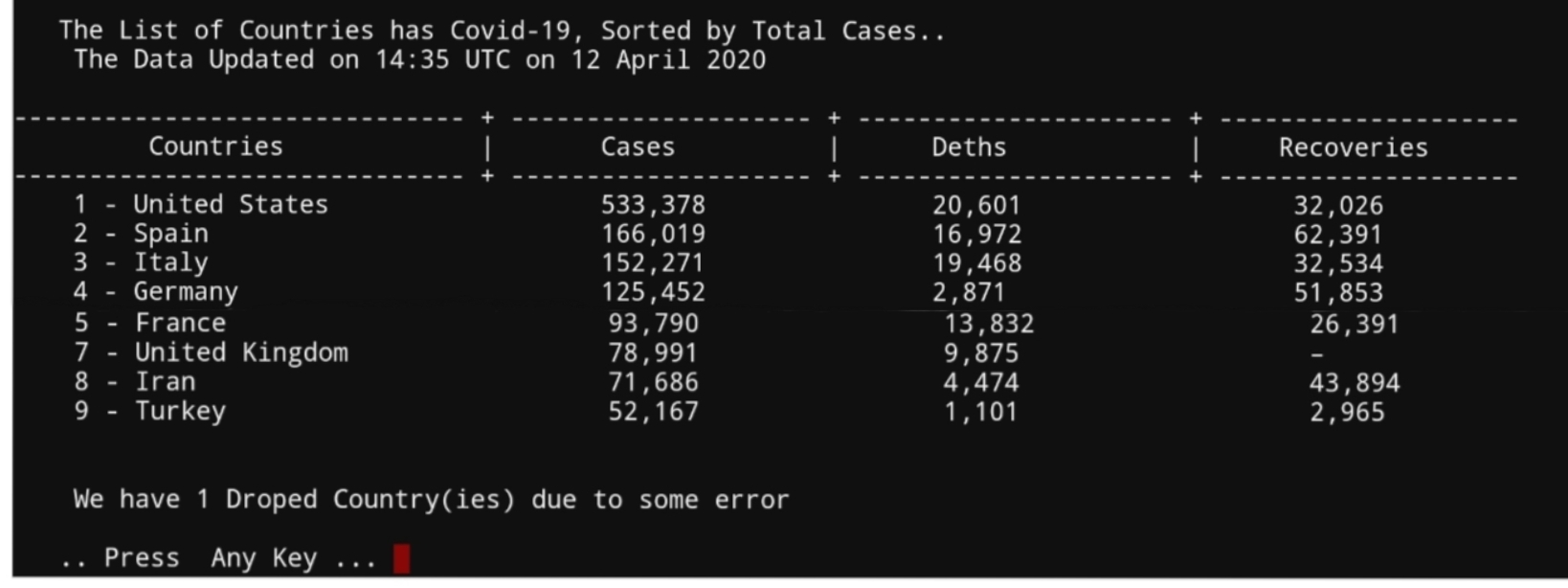 Second function we will work on is covid19_table, in this function we will print-out a table of covid19 contains countries Name, cases, Deaths and Recoveries sorted by Number of cases. In this version of application we will display only 10 records.