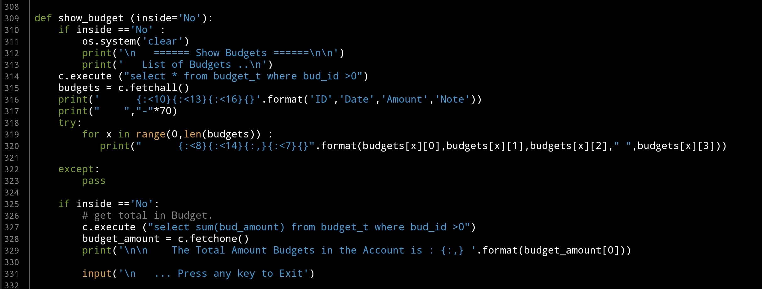 print('\n ====== Show Budgets ======\n\n')