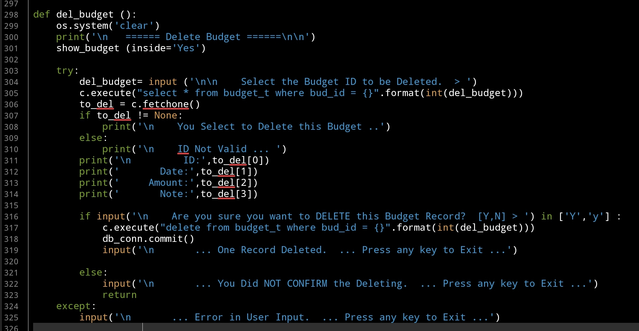 So we have another two Functions [Edit, Delete] to go, the easyer one is Deleting Budget. In Delete function we will display a table with all Budgets we have in the system and the user will enter the ID of the Budget to be Deleted, we will ask the user to confirm the action then if CONFIRMED the Budget will be Delete. .. Here is the code ..