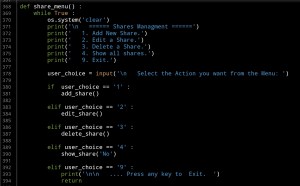 Last Function in this Artical is Delete def delete_share() : again we will call the Shoe function to display all the Shares Name on the screen and let the user to select the one to be Deleted by Entering it’s ID.