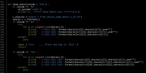 After adding shares we want to see them and to make sure if every things are fine, so we will write the show_share function, and it will take one argument as inside with default value = ‘Yes’, if we call the function from inside another function the value will be Yes, otherwise it will be ‘No’. Here is the code ..