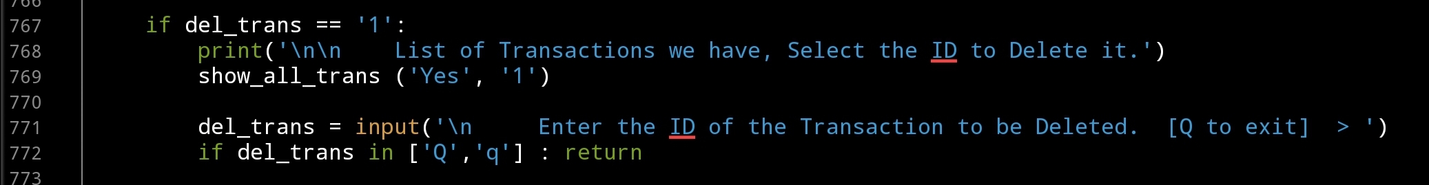 In this Part we will write the Function to Delete a Transaction from the System, and will write the last part of show_all_Transaction function.