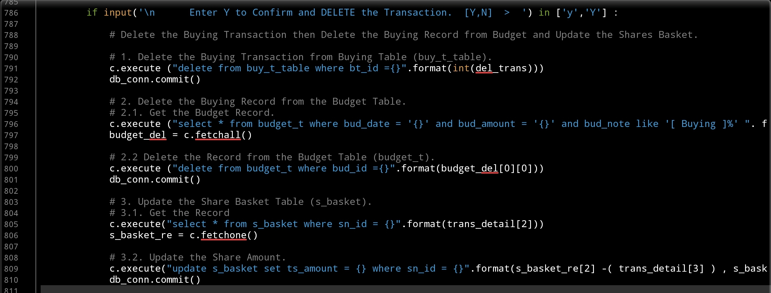 1. Buying Transaction: If the user select to Delete a Buying Transaction, we will call show_all function to display all the Buying Transactions and the ask the user to Enter the ID of the record to be Deleted. Here is the Code ..