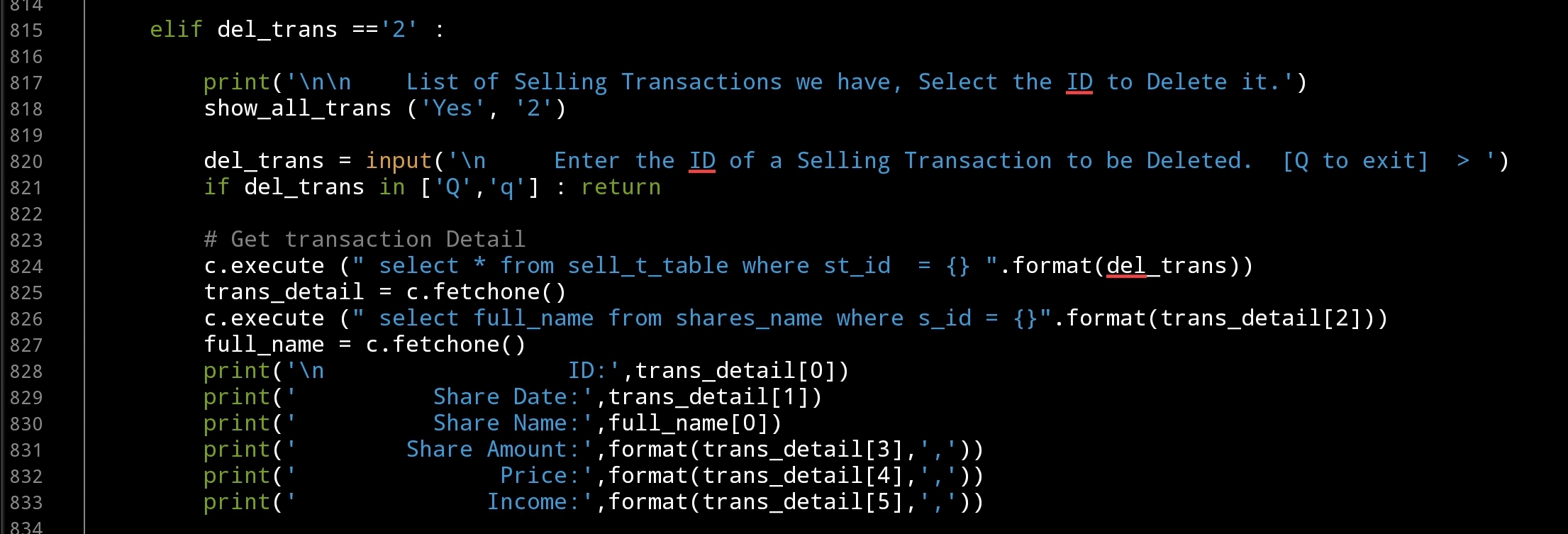 transaction. So if the user select “2. Selling Transaction:” we will call show_all function to display all the Selling Transactions and the ask the user to Enter the ID of the record to be Deleted and will display the Transaction Details. Here is the Code ..